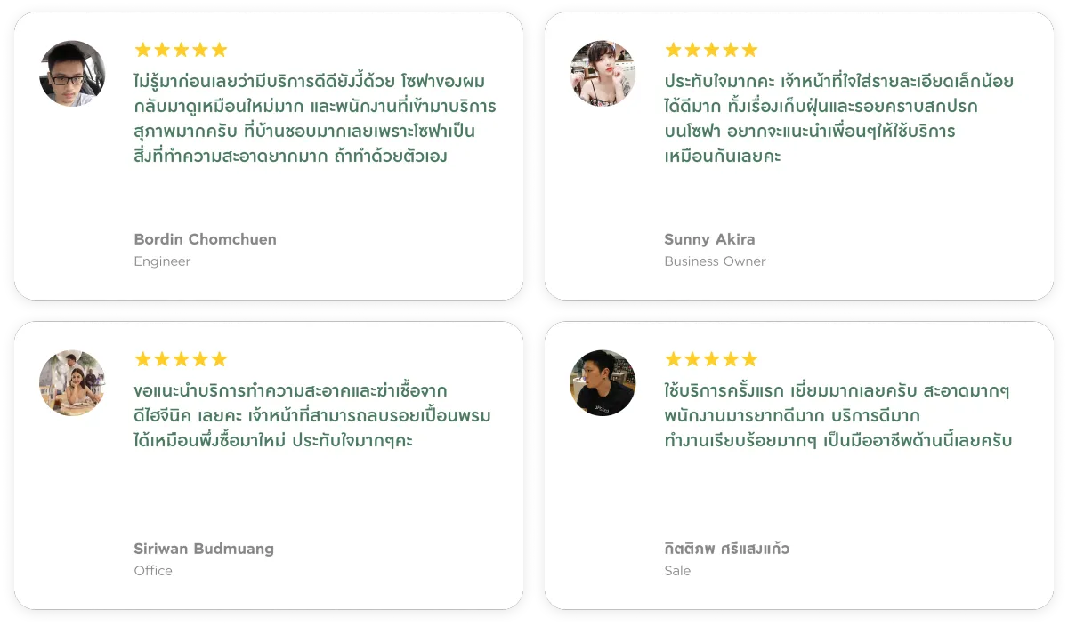 ได้ผลอย่างแน่นอน นี่คือความเชี่ยวชาญหลักของเรา การทำความสะอาดเชิงลึก ด้วยเทคโนโลยีจากเยอรมนี สามารถกำจัดไรฝุ่น, สิ่งสกปรกสะสม, และสลายกลิ่นอับชื้น ที่ต้นตอ ทำให้เฟอร์นิเจอร์และที่นอนของคุณสดชื่นขึ้นอย่างรู้สึกได้ และที่สำคัญคือช่วย ลดสารก่อภูมิแพ้ ซึ่งบรรเทาอาการ
